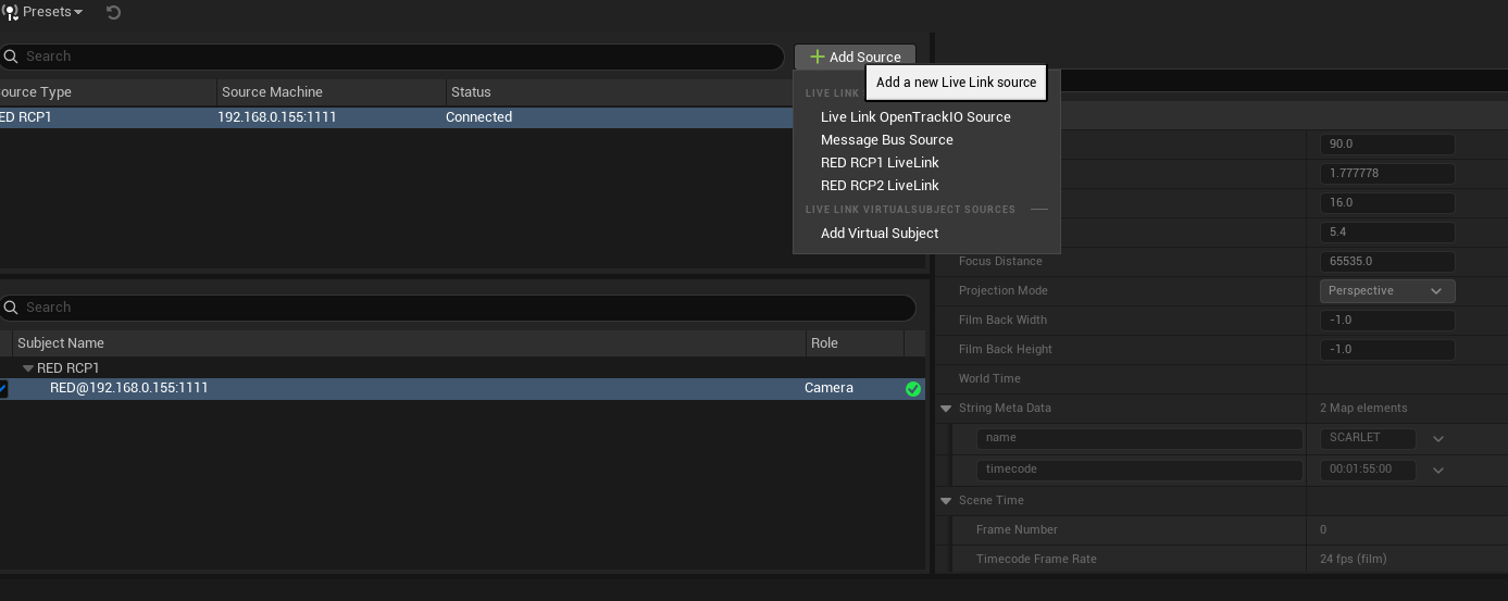 Once installed, RED RCP1 and RCP2 cameras will show up as connectable in the LiveLink window. DSMC1 and 2 cameras use RCP1, and Raptor/Komodo cameras use RCP2.
