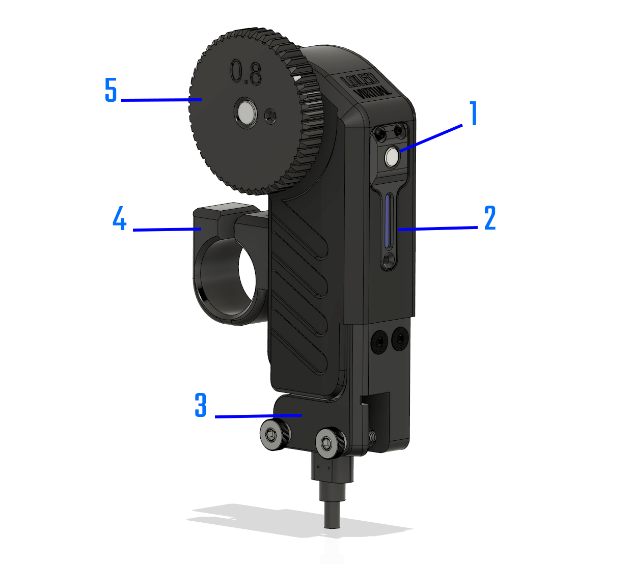 Loosen the two thumbscrews to insert a USB-C cable (included.) Once the cable is plugged in, finger tighten the thumbscrews to clamp the connector securely. The USB clamp is optional and can be removed by removing the two allen screws on the side of the encoder. This allows thicker cables or right angle connectors to be used.